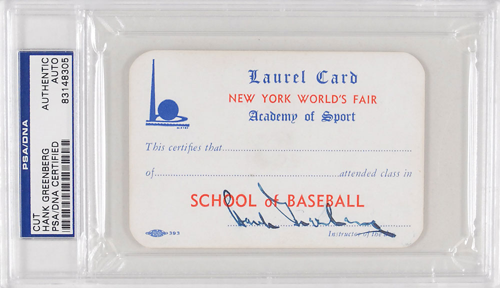 New York World's Fair Academy of Sport card circa 1939, 4 x 2.75, signed at the conclusion in fountain pen, "Hank Greenberg." The blank card would have certified that a student had attended the School of Baseball. Encapsulated in a plastic PSA/DNA authentication holder. In fine condition, with slight brushing to signature.