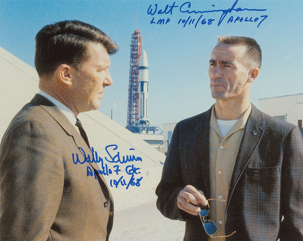 Color satin-finish 10 x 8 photo of astronauts Schirra and Cunningham conversing while their Saturn rocket looms in the background, signed in blue felt tip by both, “Walt Cunningham, LMP, 10/11/68, Apollo 7” and “Wally Schirra, Apollo 7, Cdr., 10/11/68.” In very fine condition. Pre-certified Zarelli Space Authentication.