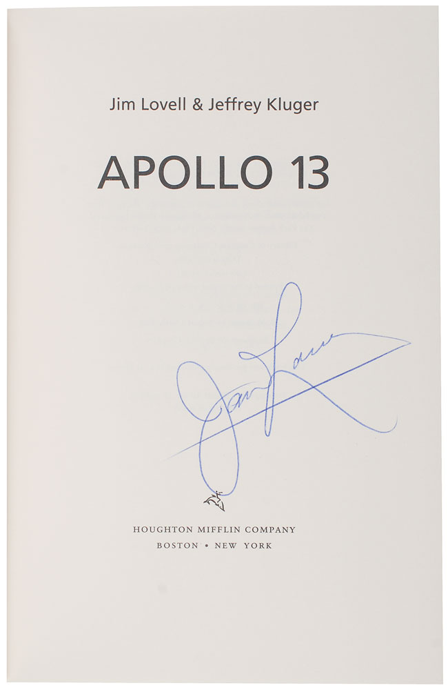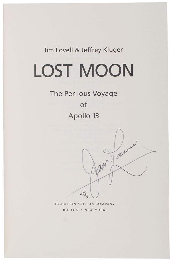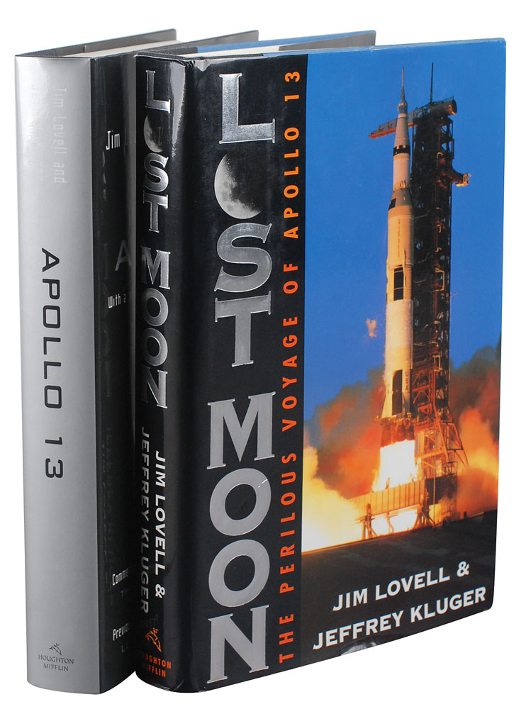 Two books: a later printing of Lost Moon, hardcover with dust jacket, signed on the title page in black ballpoint; and a later printing of Apollo 13, hardcover with dust jacket, signed on the title page in blue ballpoint. In overall fine condition, with trivial wear to dust jackets. Pre-certified Zarelli Space Authentication.