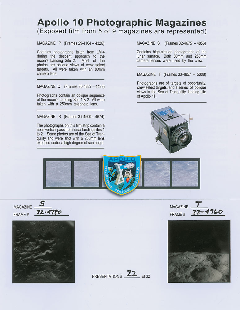Fabulous limited edition presentation of two original NASA 70mm transparencies of black-and-white film exposed during Apollo 10’s lunar orbital photography operations, unflown but produced from the original film by NASA’s photographic services shortly after the mission in 1969. Mounted inside an 8.5 x 11 certificate, numbered 22/32, signed at the bottom in blue felt tip by Commander Tom Stafford. The sheet provides a description of the mission and explanation of the photography, noting that the astronauts took 1,436 frames of still photographs during the mission using nine rolls of film. One transparency is labeled “Magazine S, Frame # 32-4780,” and shows the lunar surface filling the entire frame. The other, labeled “Magazine T, Frame # 33-4960,” shows the cratered surface in the lower half of the frame with the the pitch-black horizon seen in the background. In fine condition. An exceptional piece featuring two original NASA transparencies of the lunar surface as seen from the second Apollo mission to orbit the moon. Pre-certified Zarelli Space Authentication.