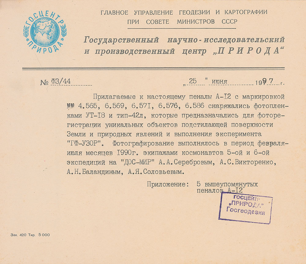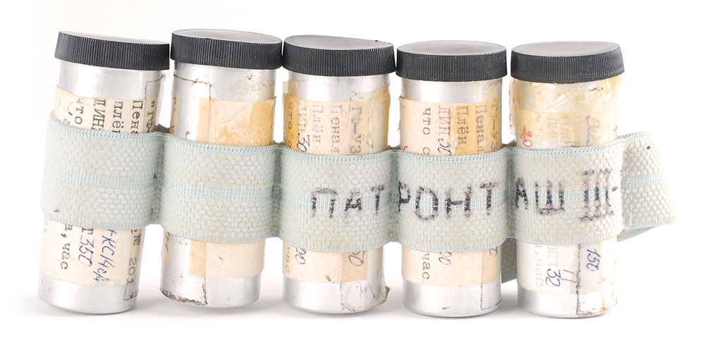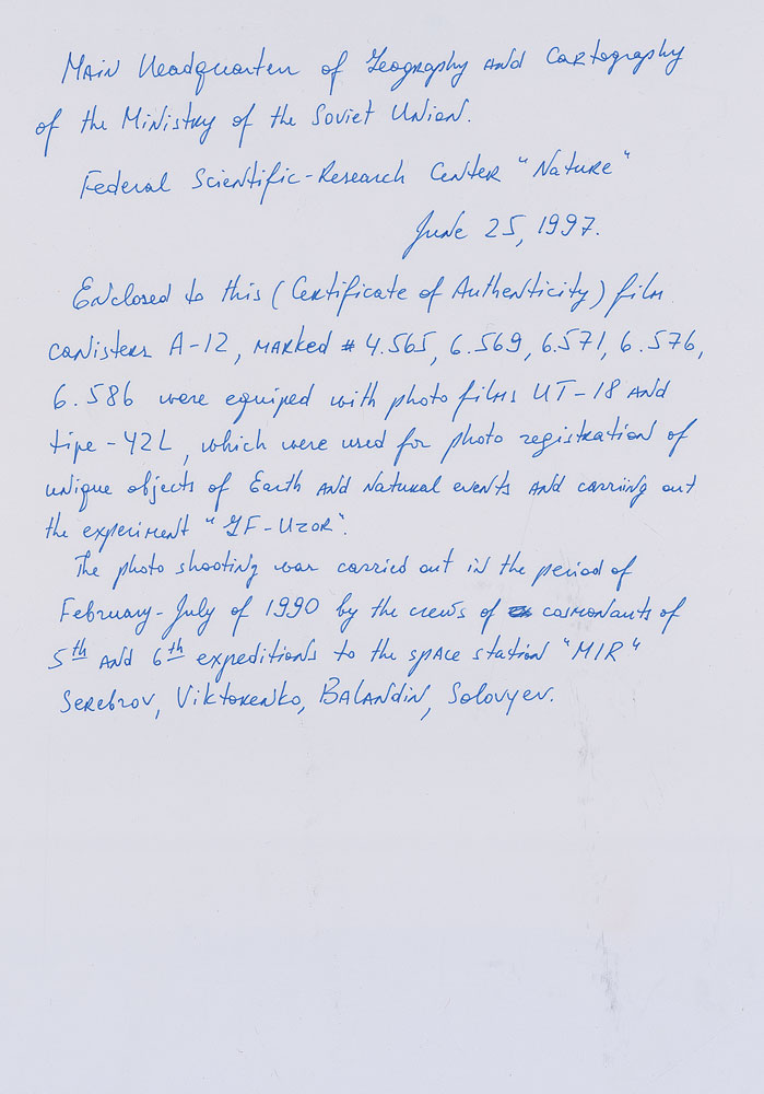 Five film canisters flown aboard the Mir Space Station from February to July of 1990. Each separately labeled canister measures 2.75″ high, and all are stored in a 21″ flexible band bearing several Russian notations. Accompanied by a typed letter of authenticity, in Russian, from the Federal Scientific Research Center, June 25, 1997, which reads, in part (translated): “Enclosed with this certificate of authenticity film canisters A-12…were equipped with photo films UT-18 and Type 42L, which were used for photo registration of unique objects of Earth and natural events and carrying out the experiment ‘GF-UZOR.’ The photo shooting was carried out in the period of February-July of 1990 by the crews of cosmonauts of 5th and 6th expeditions to the space station ‘Mir’ Serebrov, Viktorenko, Balandin, Soloviyov.” In fine condition.