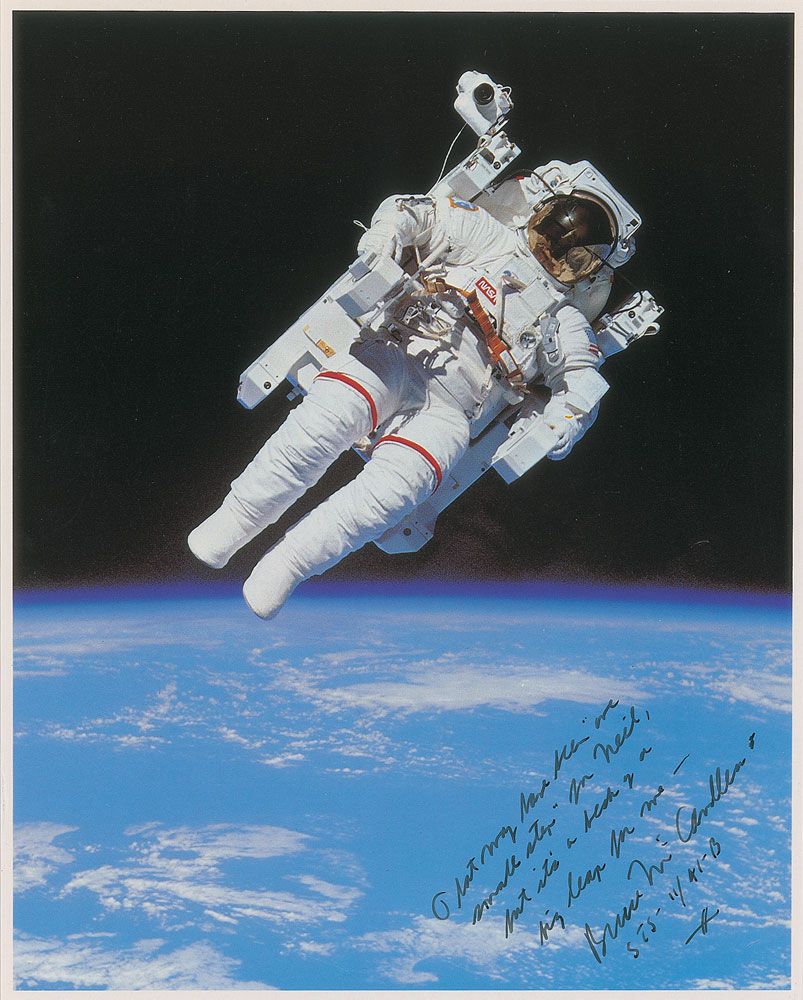Color glossy 8 x 10 cardstock photo of McCandless performing his historic EVA, humorously signed in black ink, “That may have been ‘one small step’ for Neil, but it’s a heck of a big leap for me—Bruce McCandless, STS–11/41–B.” In fine condition. Vibrant in color and clarity, this is an absolutely gorgeous capturing of McCandless’s historic untethered space walk, enhanced further still by his amusing quote. Pre-certified Zarelli Space Authentication.