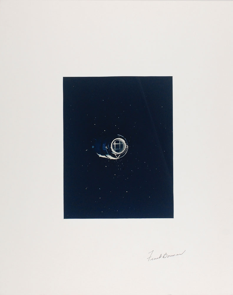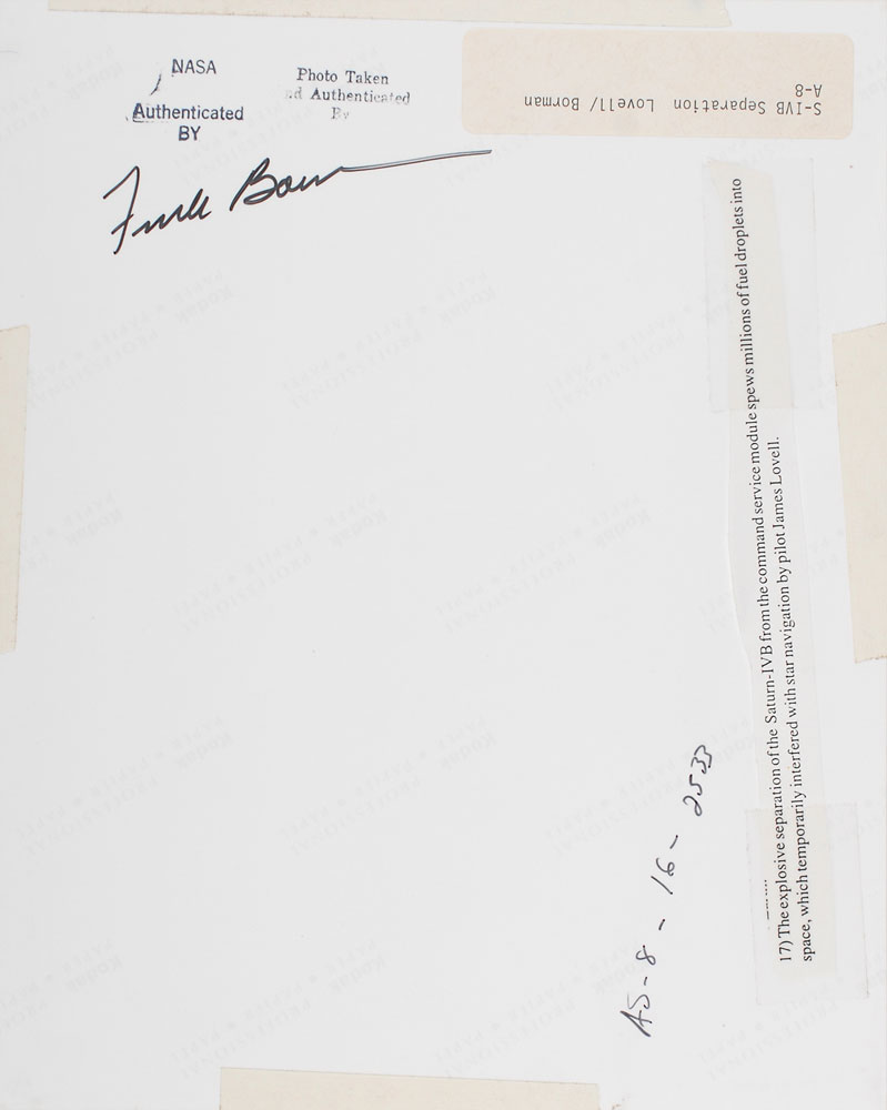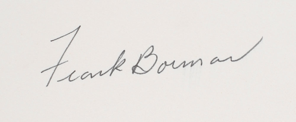 Color glossy 7.5 x 9.5 photo taken moments after the separation of the Saturn-IVB from the Apollo 8 command service module, matted to an overall size of 16 x 20, signed on the mat in black ink by Frank Borman. Reverse of photo bears a NASA authenticity stamp, “Photo taken and authenticated by,” and is signed underneath in black felt tip by Borman. In fine condition, with a diagonal bend to the photo and slight brushing to a single letter of the signature. Pre-certified Zarelli Space Authentication.