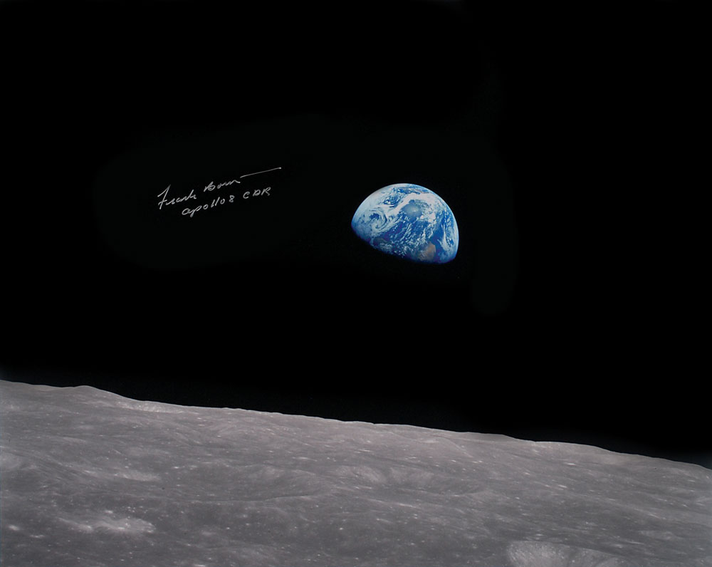 Beautiful color satin-finish 20 x 16 photo of the majestic ‘Earthrise’ photo, signed in silver ink, “Frank Borman, Apollo 8 CDR.” In fine condition, with a trivial crease to right side. Accompanied by a certificate of authenticity from Moonpans. Pre-certified Zarelli Space Authentication.