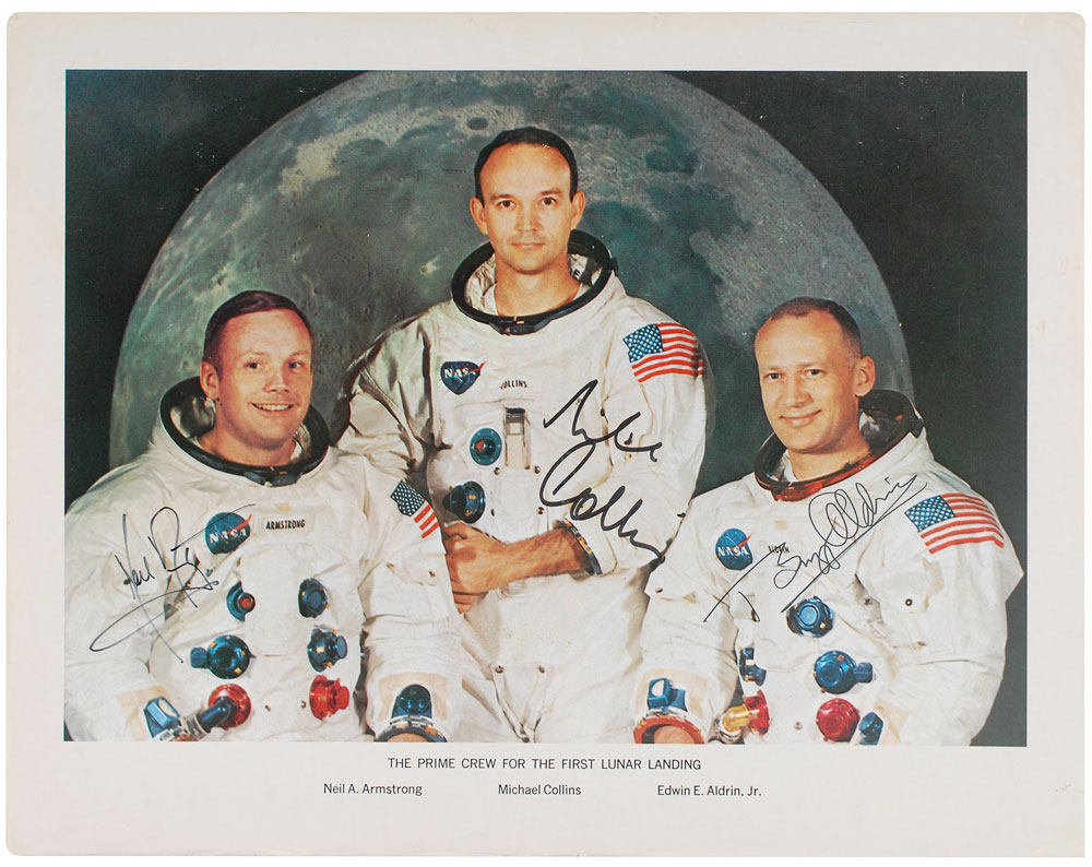 Rare oversized official color 14 x 11 NASA lithograph of the Apollo 11 crew in their white spacesuits against a lunar background, prominently signed in black felt tip by Neil Armstrong, Michael Collins, and Buzz Aldrin. Creasing to border edges (particularly along the top), otherwise fine condition. A sought-after, oversized and uninscribed example of this iconic image. Pre-certified Zarelli Space Authentication.