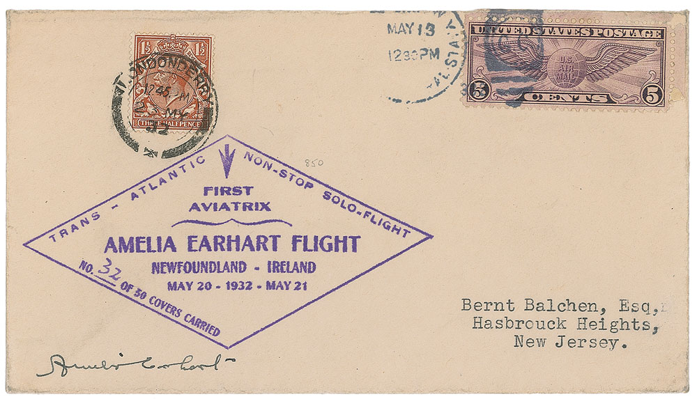Sought-after limited edition flown airmail cover carried on her historic transatlantic flight from Newfoundland to Ireland on May 20–21, 1932, 6.5 x 3.5, numbered 32/50, signed in the lower left below the stamped cachet in fountain pen, “Amelia Earhart.” Addressed in type to her fellow aviation pioneer Bernt Balchen. Two stamps are affixed to the cover: one three halfpence revenue stamp postmarked at the site of her landing, Londonderry, Northern Ireland, two days after completing her flight on May 23; and one desirable five-cent US airmail postage stamp, postmarked at Grand Central Station, May 13. In fine condition. As a cover carried on Earhart’s historically important flight as the first woman to make a nonstop solo crossing of the Atlantic, this piece is scarce of the utmost desirability. Pre-certified PSA/DNA.