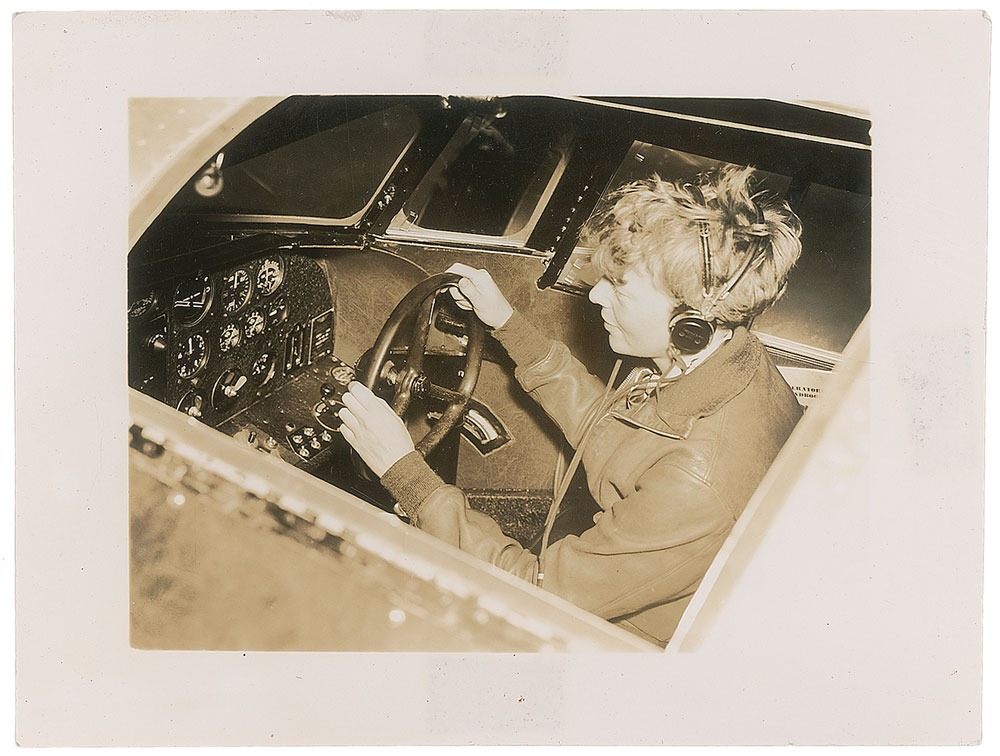 Original unsigned glossy 5.25 x 4 photo of Earhart in a plane’s cockpit with the complex instrument panel clearly visible, stamped on the reverse, “Newspaper-Magazine Aerial & Commercial Photography, Photo. No. 374,” noting that reproduction is prohibited without permission. In fine condition, with trivial creases and slight show-through at borders from toned tape to reverse.