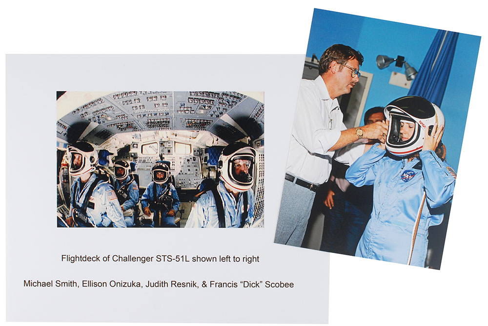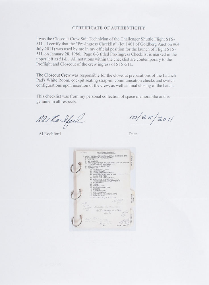 Extraordinary closeout checklist used in preparation for the tragic launch of Space Shuttle Challenger on mission STS-51-L, nine double-sided 6 x 8 pages numbered 6-3 to 6-20, with tabs labeled “Pre-Ingress Checklist,” “Close-Out Crew Ingress,” and “Crew Ingress.” The checklist was used by suit technician Al Rochford, a member of the closeout crew, and bears contemporary ballpoint and pencil notations to the first four pages, with some notations on the first page, such as “51L,” “Suit Tech—Al Rochford,” and “ASP—Sonny Carter.” A sixteenth step on the ASP Tool Kit checklist has also been added, “16. Alcohol Wipes & Tissues,” as well as information on “Pad ‘A’” and “Pad ‘B.’” The following page notes adjustments of the headrests of 5.5″ for Ellison Onizuka and 3″ for Judy Resnik. A few of the other steps have also been crossed out or modified, and each checked off in the margin. The final page lists the procedures for the ASP [Astronaut Support Person], giving a poignant, haunting final instruction: “Wave to crew!” This would be their final farewell. In fine condition, with pages laminated for preservation. Accompanied by a letter of provenance signed by Rochford, in part: “I was the Closeout Crew Suit Technician of the Challenger Shuttle Flight STS-51L. I certify that the ‘Pre-Ingress Checklist’…was used by me in my official position for the launch of Flight STS-51L on January 28, 1986. Page 6-3 titled Pre-Ingress Checklist is marked in the upper left as 51-L. All notations with the checklist are contemporary to the Preflight and Closeout of the crew ingress of ST-51L.”