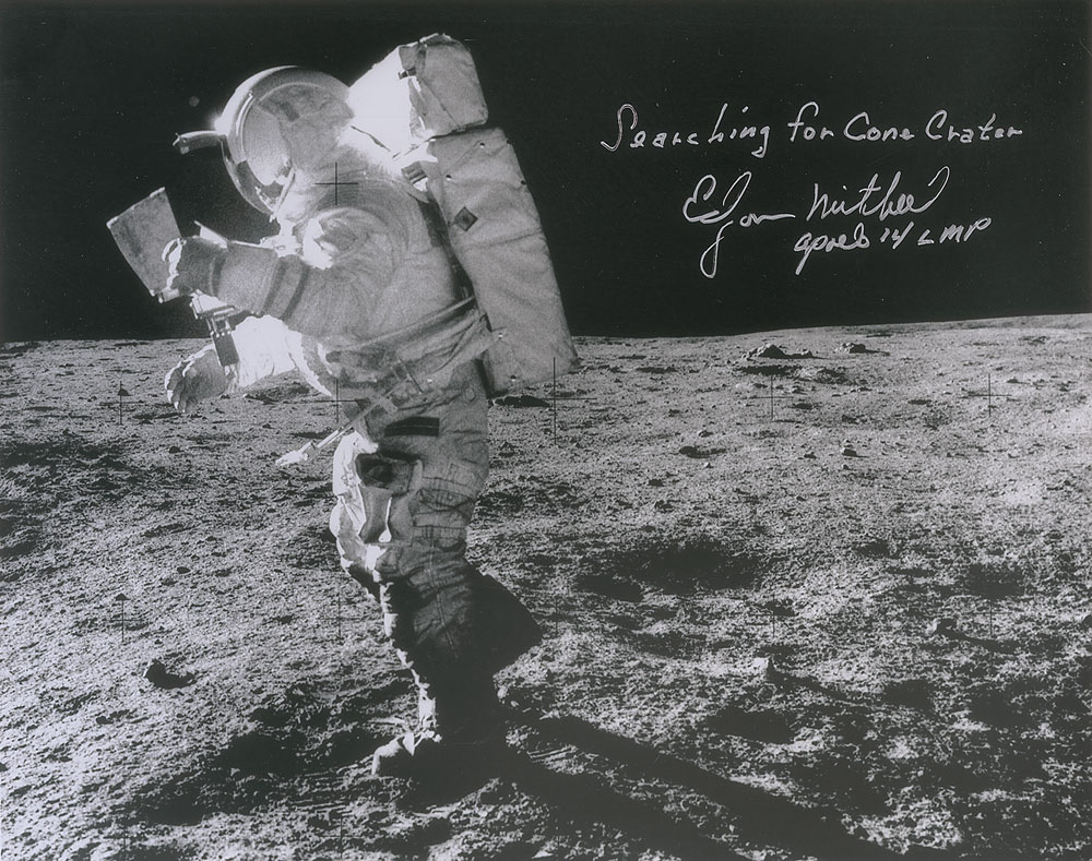 Satin-finish 10 x 8 photo of Mitchell walking along the lunar surface, signed in silver ink, “Searching for Cone Crater, Edgar Mitchell, Apollo 14 LMP.” In fine condition. Pre-certified Zarelli Space Authentication.
