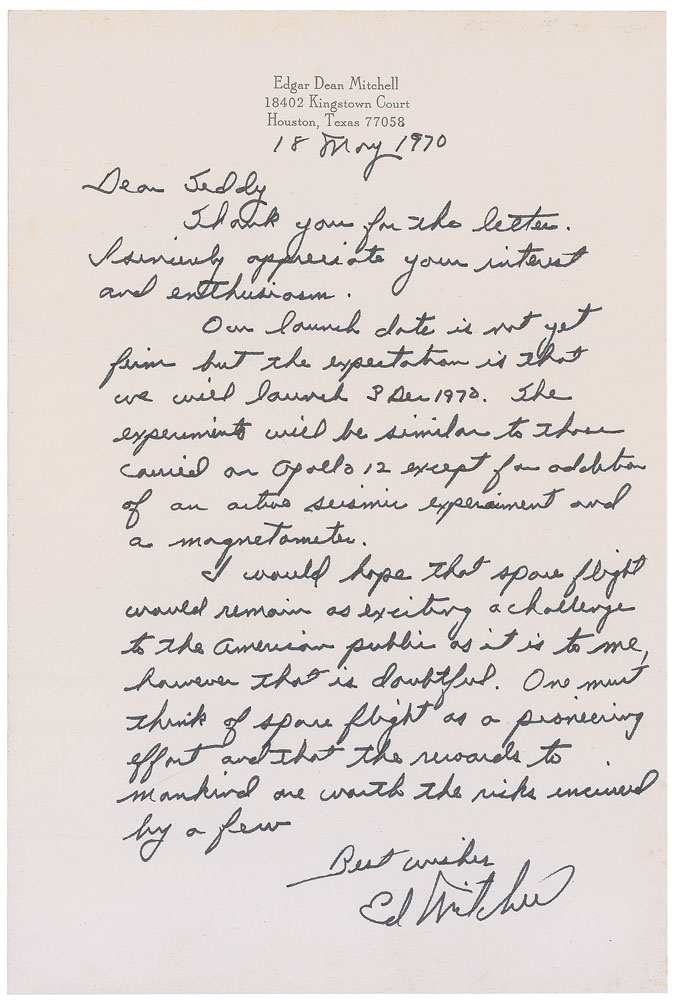 ALS signed “Ed Mitchell,” one page, 7.25 x 10.75, personal letterhead, May 18, 1970. Letter to Teddy, in part: “Our launch date is not yet firm but the expectation is that we will launch 3 Dec 1970. The experiment will be similar to those carried on Apollo 12 except for addition of an active seismic experiment and a magnetometer. I would hope that space flight would remain as exciting a challenge to the American public as it is to me, however that is doubtful. One must think of space flight as a pioneering effort and that the rewards to mankind are worth the risks incurred by a few.” In fine condition, with some light horizontal folds. Pre-certified Zarelli Space Authentication.