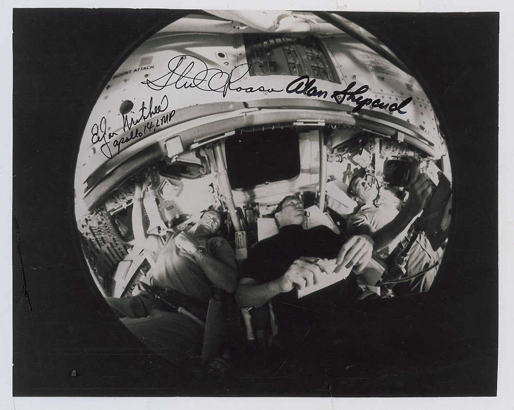 Uncommon official glossy 10 x 8 NASA photo showing the Apollo 14 crew training in the command module simulator, signed in black ink, “Edgar Mitchell, Apollo 14, LMP” and “Stu A. Roosa,” and in black felt tip, “Alan Shepard.” Small tears to left and bottom edges (one tape-repaired), a piece of tape to top edge, trivial creasing to edges, and a few small areas filled in with black felt tip, otherwise fine condition. Pre-certified Zarelli Space Authentication.