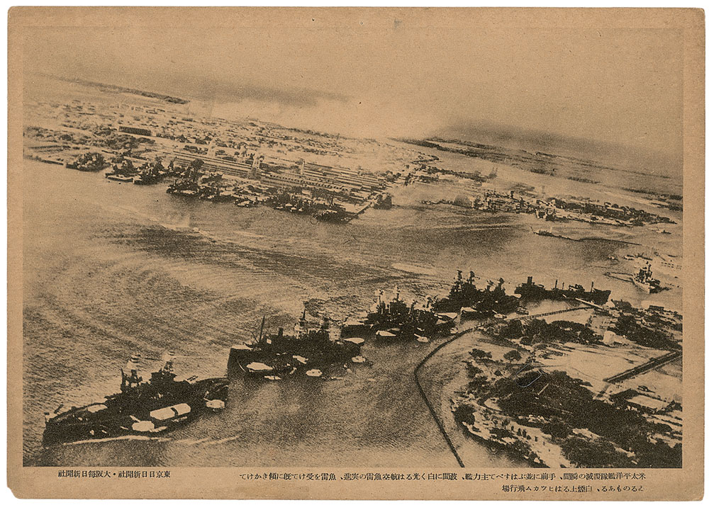 Three Japanese printed cardstock photographs, 10.5 x 7.25, celebrating the attack on Pearl Harbor in 1941, with images showing: two Japanese Zeros in the air with a plume of smoke rising from the USS Oklahoma in the center; a side-view of the extensive damage of Battleship Row as oil slicks spill from the ships; and an aerial view of Battleship Row with the USS Arizona already under water. Uniform toning and light edgewear, otherwise overall fine condition.