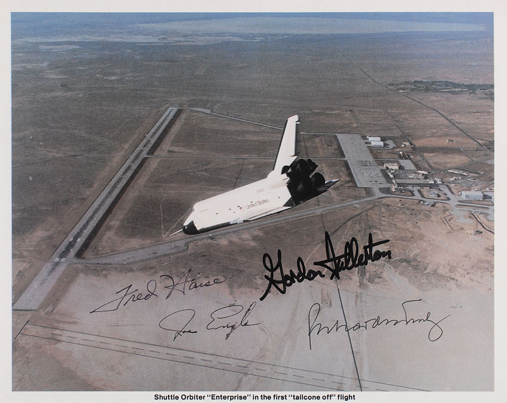 Official color 10 x 8 NASA lithograph of the first flight of the Space Shuttle Enterprise minus its tail cone on October 12, 1977, signed in black ink by Joe Engle and Richard Truly, and in black felt tip by Gordon Fullerton and Fred Haise. In fine condition, with brushing to a portion of Engle’s last name. Pre-certified Zarelli Space Authentication.