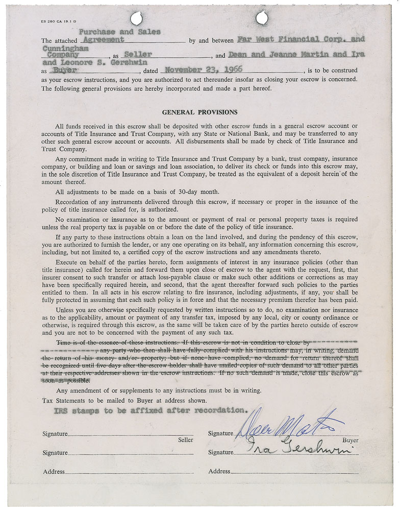 Carbon DS, one onionskin page, 8.5 x 11, November 23, 1966. General provisions section of a purchase and sales agreement between sellers “Far West Financial Corp. and Cunningham Company” and buyers “Dean and Jeanne Martin and Ira and Leonore S. Gershwin.” Signed at the conclusion in blue ballpoint, “Dean Martin,” and in black felt tip, “Ira Gershwin,” with both signing over their lightly transferred carbon signatures. In fine condition, with expected document wear. Pre-certified PSA/DNA.