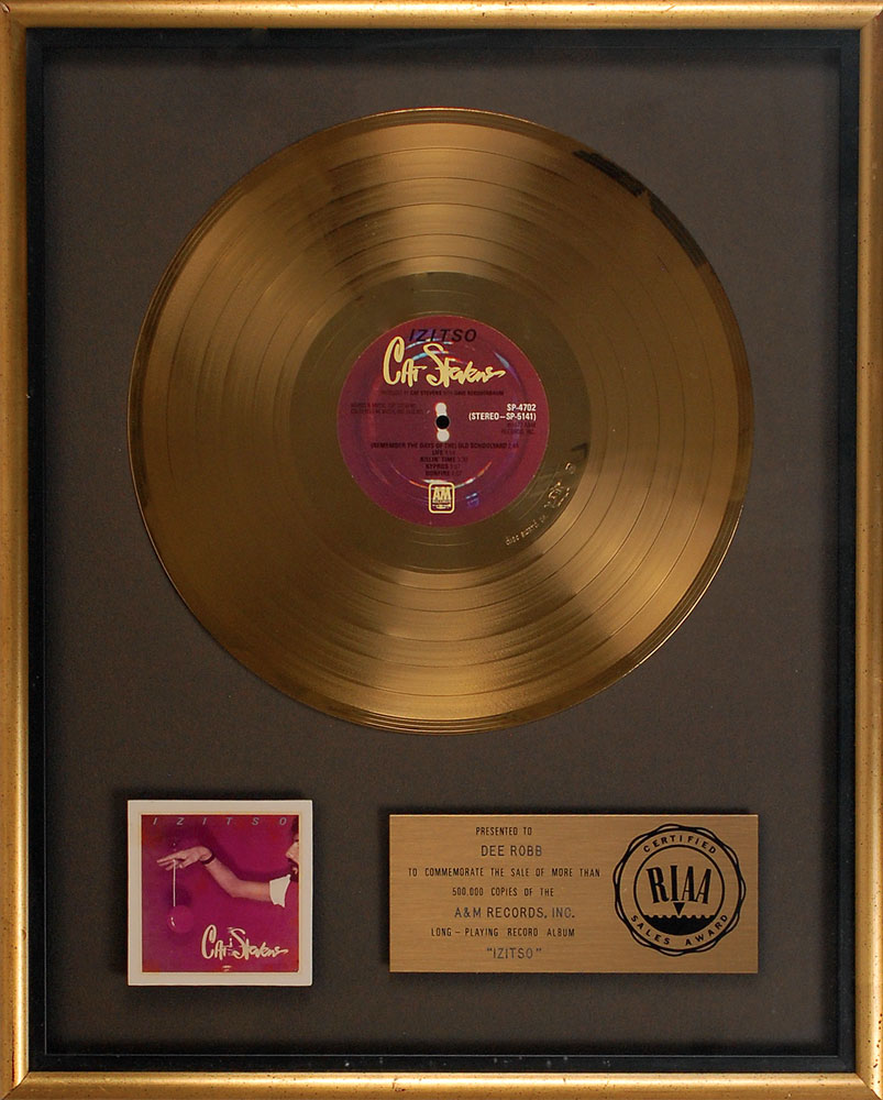 Official floater-style RIAA gold sales award presented “to commemorate the sale of more than 500,000 copies of the A&M Records, Inc. long-playing record album ‘Izitso.’” Framed with its Disc Award Ltd. disc, plate, and a small image of the album cover to an overall size of 16.75 x 20.75. Award retains its original backing with a Creative Glassics label. In fine condition.
