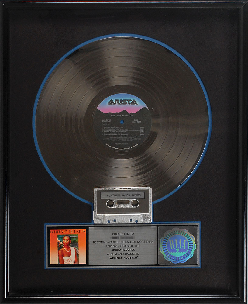 Official flower hologram-style RIAA platinum sales award presented “to commemorate the sale of more than 1,000,000 copies of the Arista Records album and cassette ‘Whitney Houston.’” Framed with its disc, cassette, and plate bearing a small image of the album cover to an overall size of 16.75 x 21. Award retains its original backing with a Creative Glassics label. In fine condition, with trivial scuffing to frame.