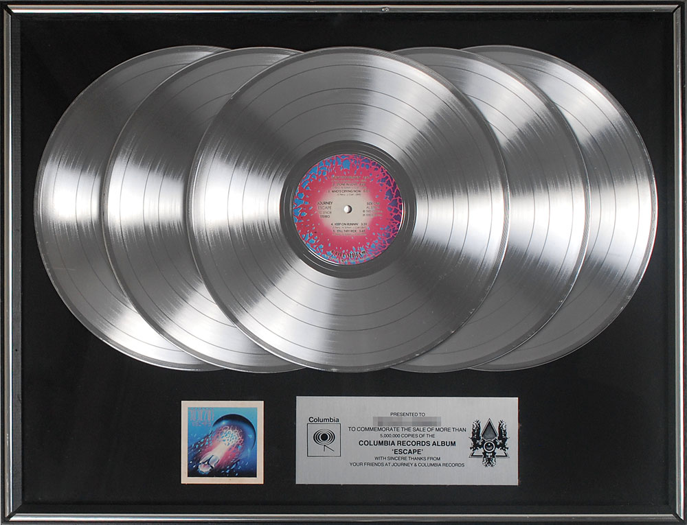 In-house multi-platinum sales award presented “to commemorate the sale of more than 5,000,000 copies of the Columbia Records album ‘Escape.’” Framed with its discs, plate, and a small image of the album cover to an overall size of 25.25 x 19.25. In fine condition, with some scuffing to the frame.