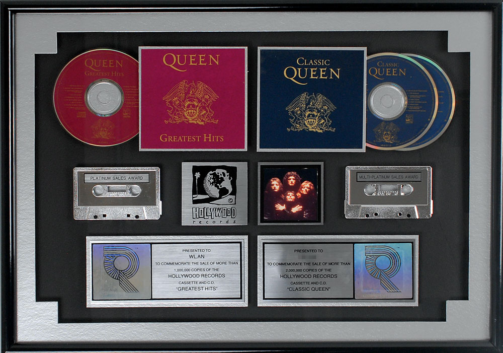 Pair of official ‘R’ hologram-style RIAA sales awards, platinum and double platinum, presented “to commemorate the sale of more than 1,000,000 copies of the Hollywood Records cassette and C.D. ‘Greatest Hits’” and “the sale of more than 2,000,000 copies of the Hollywood Records cassette and C.D. ‘Classic Queen.’” Both are framed with their cassettes, CDs, plates, and images of the band, the record label logo, and the two album covers to an overall size of 23 x 17. Award retains its original backing with a Creative Glassics label. In fine condition.