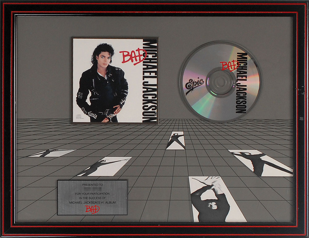 In-house appreciation award presented for “participation in the success of Michael Jackson’s #1 album ‘Bad.’” Framed with its CD, plate, and an image of the album cover to an overall size of 17.75 x 13.75. Award retains its original backing with a Fitzgerald Hartley label. In fine condition, with slight chipping to frame.