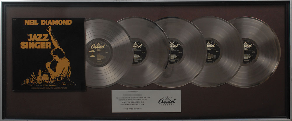 In-house multi-platinum sales award presented “to commemorate the worldwide sale of more than 5,000,000 copies of the Capitol Records, Inc. long-playing record album ‘The Jazz Singer.’” Framed with its plate, five discs, and LP sleeve to an overall size of 49 x 20.75. Award retains its original tape-repaired backing. In fine condition, with scattered scuffing to frame. Oversized.
