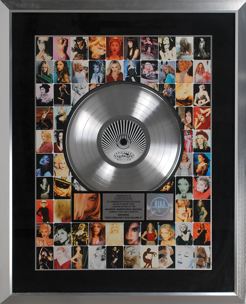 Official serial number hologram-style RIAA platinum sales award presented “to commemorate RIAA certified sales of more than 1,000,000 copies of the Maverick / Warner Bros. Records compact disc and cassette Madonna: ’GHV2 Greatest Hits Volume 2.’” Framed with its disc, CD, and plate bearing a small image of the album cover against a huge collage of Madonna at various points of her career to an overall size of 25.5 x 31.75. Award retains its original backing with a Jewel Box Platinum label. In fine condition, with two slight dents to right side of frame. Oversized.