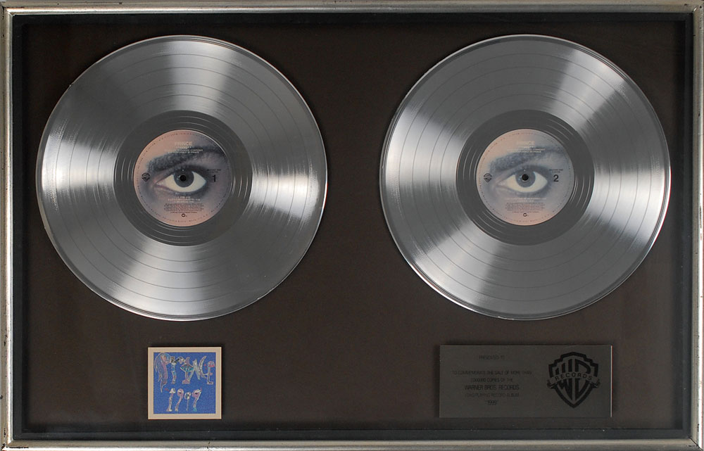 In-house double platinum sales award presented “to commemorate the sale of more than 2,000,000 copies of the Warner Bros. Records long-playing record album ‘1999.’” Framed with its discs, plate, and a small image of the album cover to an overall size of 28.75 x 18.75. Award retains its original backing. In fine condition, with trivial scuffing to the frame.