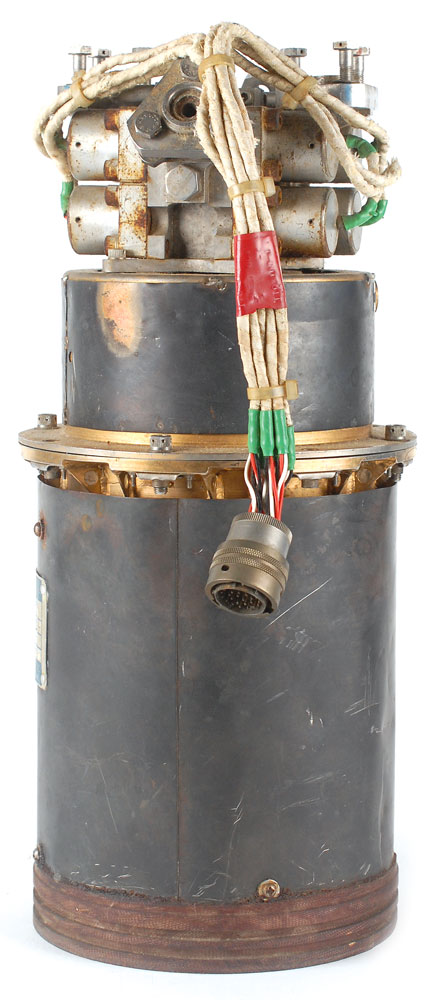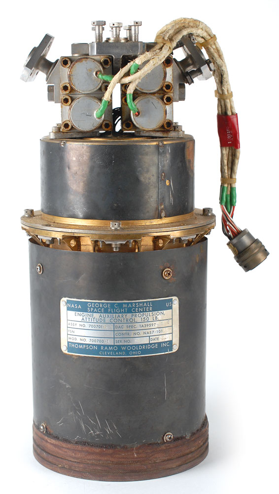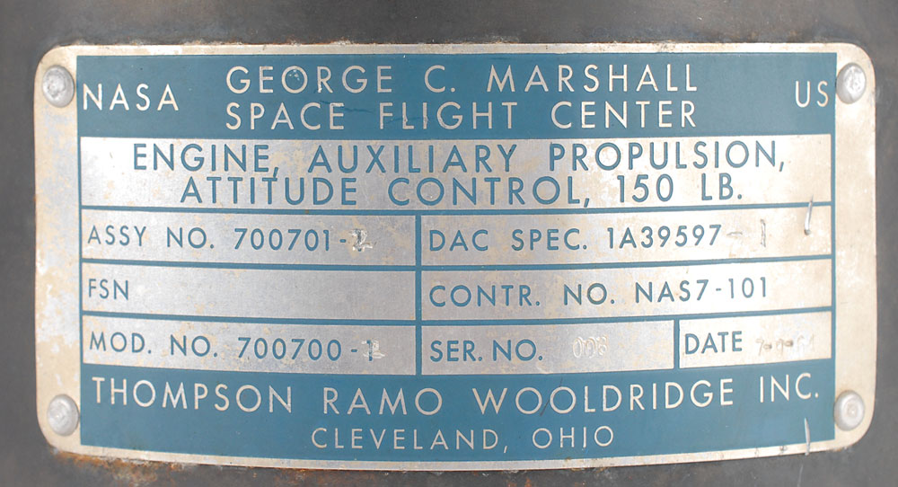 Prototype TR204 Saturn V Third Stage Auxiliary Propulsion System Rocket engine, measuring approximately 16″ long with a 6.75″ diameter nozzle, with a George C. Marshall Space Flight Center metal label with both printed and engraved text, reading, “Engine Auxiliary Propulsion Attitude Control 150 LB., Assy No. 700701-2, Mod. No. 700700-2, DAC Spec. 1A39597-1, Contr. No. NAS7-101, Ser. No. 008, Date 7-9-64.” Fabricated by Thompson Ramo Wooldridge (TRW), the nozzle and chamber are made of phenolic impregnated silica with fiberglass overwrap. The nozzle has a sprayed zirconia coating, with the propellant inlets and valves made of metal. Its design is unique—because of the requiremet for high reliability, the engine was designed with quad-redundant valves. In fine condition, with scattered marks and dings. These engines were in service from January 1966 to July 1975 and saw application on every Saturn V Moon rocket to provide attitude control of the Third Stage during Earth Orbit and Trans-Lunar Injection. These engines also provided propulsion after third stage separation from the Command Service Module to propel the Third Stage to impact on the Moon's surface. A magnificent piece of early Apollo history as a necessity for man’s voyage to the moon. This item is export restricted.