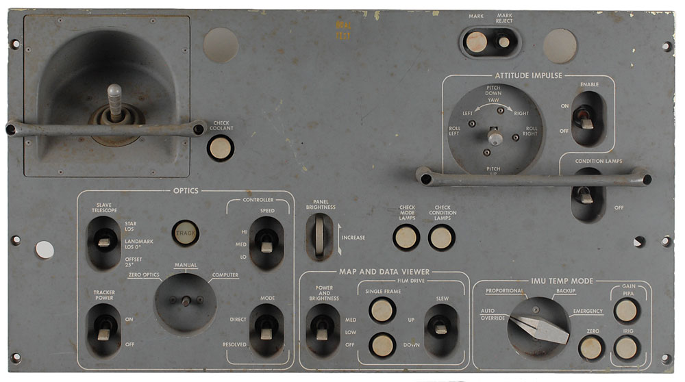 Lower Equipment Bay (LEB) Control Panel 105 assembly that comprised part of the Guidance and Navigation interface, 23.5 x 13, bearing a NASA parts label on the reverse of the panel reading, “Apollo G&N System, G&N Indicator Control Panel Assembly, Part No. 1014664-021, Serial No. ACSK 3, Cont. No. NAS 9-497.” The panel is stenciled “Qual Test” in several areas in yellow text. Sections of the front of the panel are labeled “Optics,” “Attitude Impulse,” “Map and Data Viewer,” and “IMU Temp Mode,” all with various buttons, switches, and controls; an area to the upper left is inset with a joystick control. The “Tracker Power” toggle switch to the lower left was unique to and identifies this panel as either intended for or originating from Apollo Command Module 014; this spacecraft was slated to fly as Apollo 2 but dismantled after the Apollo 1 fire. Scattered soiling, otherwise fine condition. The Guidance and Navigation system measured spacecraft attitude, controlled the thrust vector of the main and reaction control engines, and provided abort information and display data. An especially desirable artifact given its early date in the Apollo program and overall visual appeal.