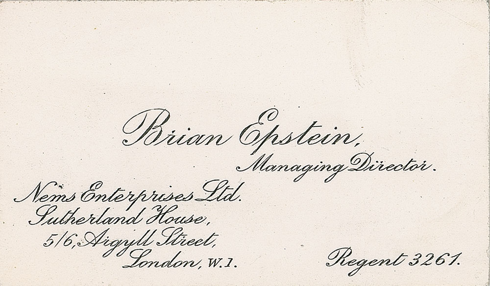 Original circa 1960s Brian Epstein business card identifying him as managing director of NEMS Enterprises Ltd., 3 x 1.75, giving the company’s London address. Light creases to upper left, otherwise fine condition. From the estate of Brian Epstein. Accompanied by a certificate of authenticity from Tracks.