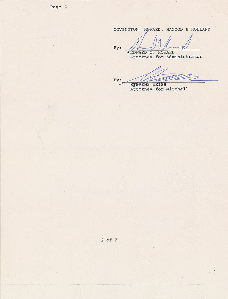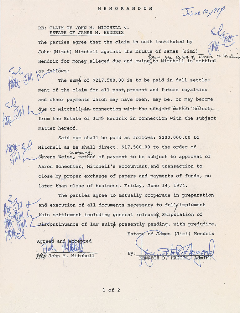 DS, signed “John Mitchell,” two pages, 8.5 x 11, June 10, 1974. Legal document concerning compensation and royalties from his work in the Jimi Hendrix Experience. In part: “The parties agree that the claim instituted by John (Mitch) Mitchell against the Estate of James (Jimi) Hendrix for money alleged due…is settled as follows: The sum of $217,500.00 is to be paid in full settlement of the claim.” Signed at the conclusion by Mitchell using his given name, and initialed by him, “JM,” in seven additional places. In fine condition, with expected document wear. Accompanied by a certificate of authenticity from Tracks. Pre-certified REAL.