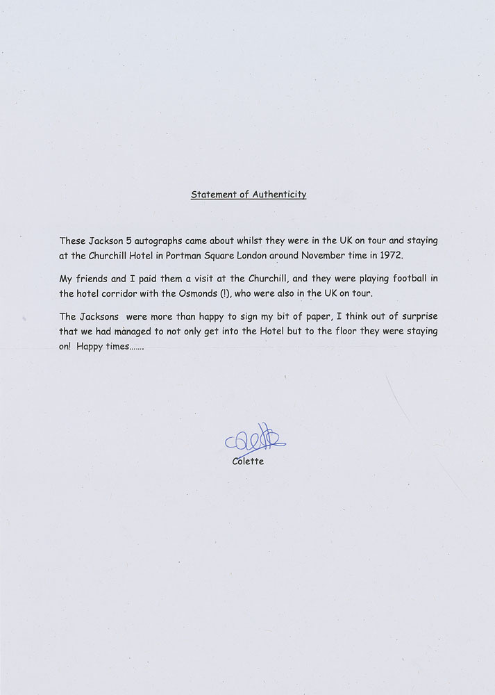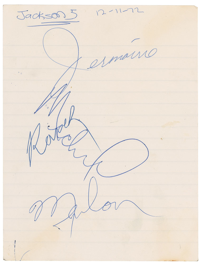 Vintage circa 1972 ballpoint signatures, “Michael,” “Randy,” “Jermaine,” and “Marlon,” on a lightly-lined 5.25 x 7 sheet. A central horizontal fold passing through a couple letters of Michael’s signature, light scattered creases, and trivial toning, otherwise fine condition. Accompanied by a certificate of authenticity from Tracks and a letter of provenance from the original recipient, stating that the autographs were acquired at the Churchill Hotel, London, in November 1972. Pre-certified REAL.