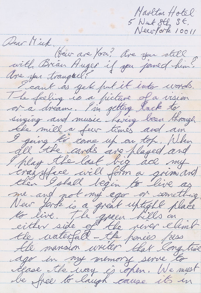 ALS signed “Van,” two pages, 7.25 x 10.5, no date. Letter to “Mick.” In part: “I’m getting back to singing and music having been through the mill a few times and am I going to come up on top. When all the cards are played and I play the last big ace my crazyface will form a grin and then I shall begin to live as me—and not my ego or something.” In very good condition, with light foxing and dampstaining (not affecting legibility). Accompanied by a certificate of authenticity from Tracks. Pre-certified REAL.