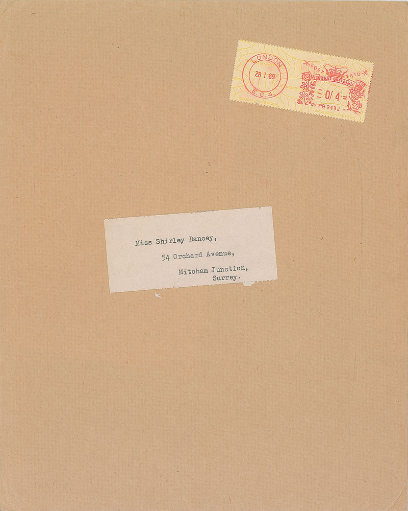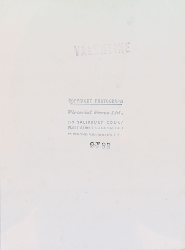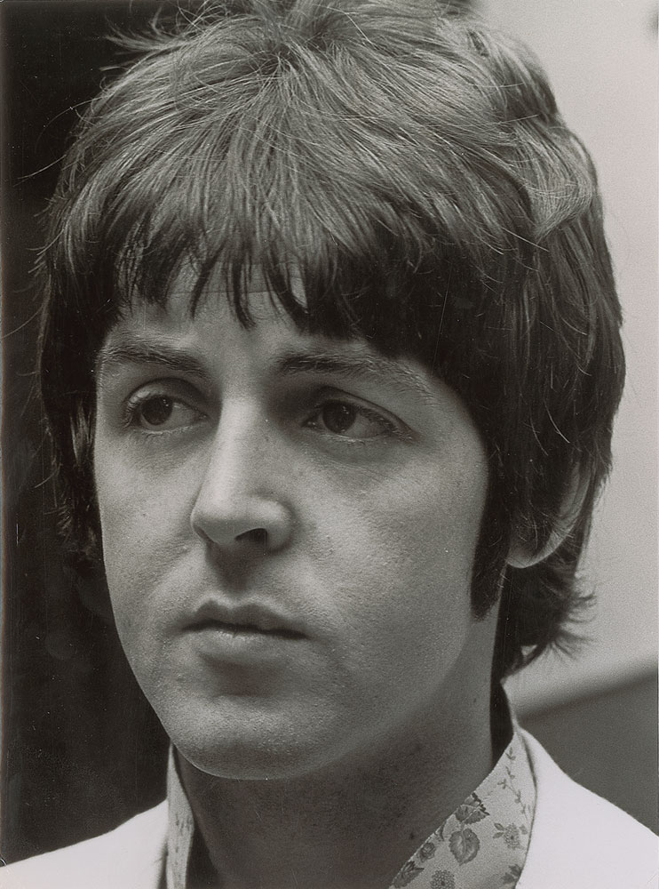 Crisp original glossy 7.5 x 10 press photo of McCartney close up, stamped on the reverse by Pictorial Press Ltd and Valentine Magazine. Includes the original mailing envelope from Valentine Magazine, postmarked January 28, 1969. In fine condition, with mild scattered creases. Accompanied by a certificate of authenticity from Tracks.