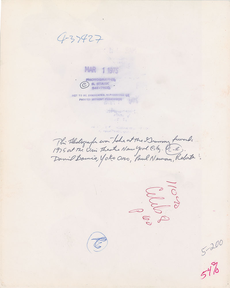 Original glossy 10 x 8 press photo of music icons John Lennon, Yoko Ono, David Bowie, and Roberta Flack together at the 1975 Grammy Awards. Reverse is stamp-dated March 1, 1975, and bears the copyright notice of photographer “S. Stark.” In fine condition. Accompanied by a certificate of authenticity from Tracks.