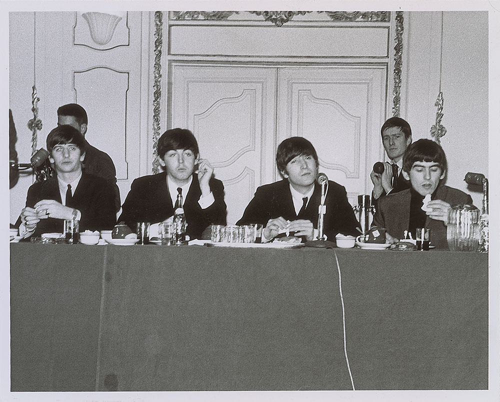 Original matte-finish 10 x 8 press photo showing the four members of the Beatles at a press conference in 1964. Stamped on the reverse by 16 Magazine. In fine condition. Accompanied by a certificate of authenticity from Tracks.
