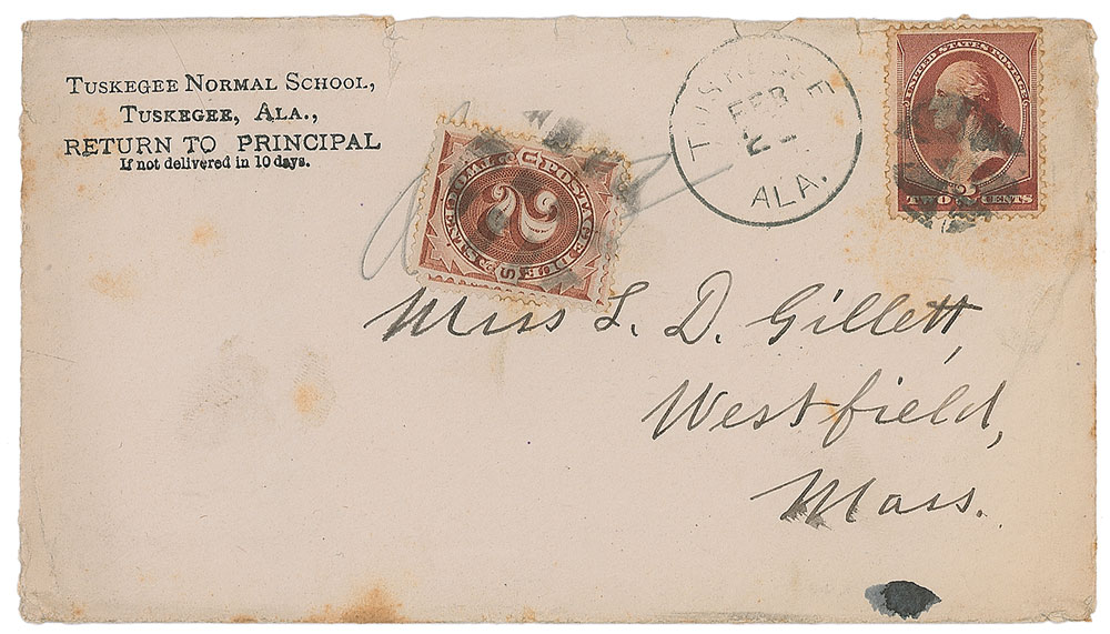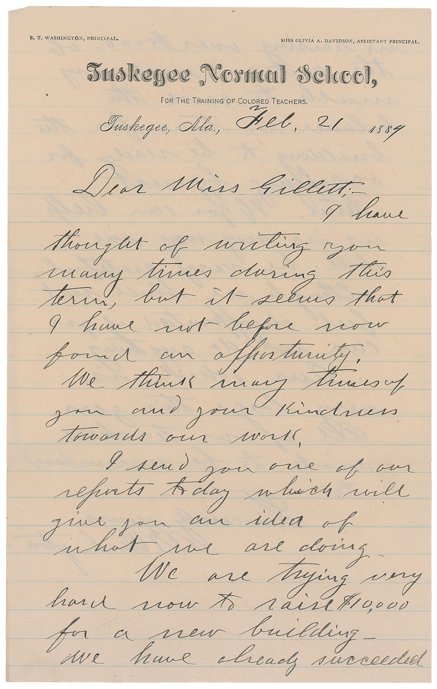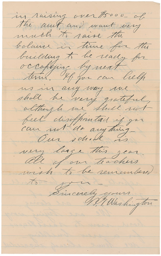 Desirable ALS signed “B. T. Washington,” one page, lightly-lined both sides, 6 x 9.5, Tuskegee Normal School letterhead, February 21, 1884. Letter to a woman soliciting a donation, in part: “We think many times of you and your kindness towards our work. I send you one of our reports today which will give you an idea of what we are doing. We are trying very hard now to raise $10,000 for a new building—we have already succeeded in raising over $5000 of the amt, and want very much to raise the balance in time for the building to be ready for occupying by next term. If you can help us in any way we shall be very grateful, although we shall not feel disappointed if you cannot do anything.” In fine condition, with a couple trivial edge tears. Accompanied by a full letter of authenticity from PSA/DNA and the original mailing envelope, addressed in Washington’s own hand.