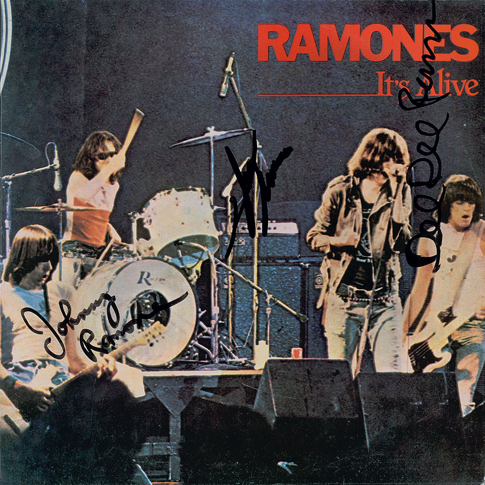Portuguese pressing of the Ramones’ It’s Alive two-LP album signed on the front cover in black felt tip by Joey, Johnny, and Dee Dee Ramone. In fine condition, with trivial rubbing. The records are included. Pre-certified REAL.