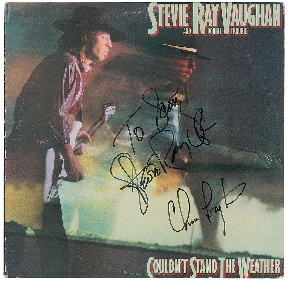 Couldn’t Stand the Weather album signed and inscribed on the front cover in black felt tip, “To Scott, Stevie Ray Vaughan” and “Chris Layton.” A light ‘ring of wear’ and wear to edges, otherwise fine condition. The record is included. Pre-certified REAL.