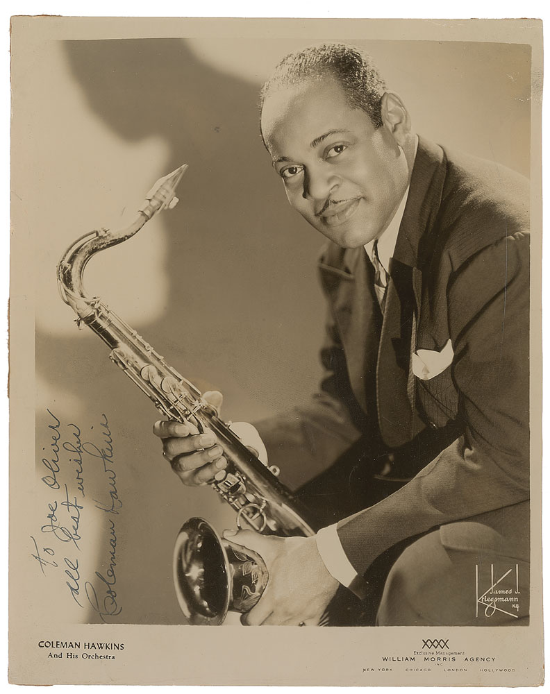Vintage glossy 8 x 10 William Morris Agency publicity photo showing Hawkins holding his tenor saxophone, vertically signed and inscribed in fountain pen, “To Joe Oliver, all best wishes, Coleman Hawkins.” In very good condition, with scattered bends and creases, light crazing to emulsion, a small repaired edge tear to upper right, and trimmed edges. The Larry Rafferty Collection. Pre-certified PSA/DNA.
