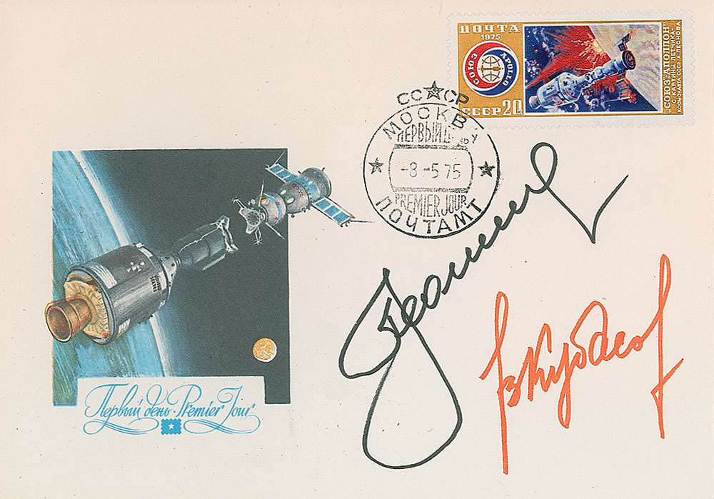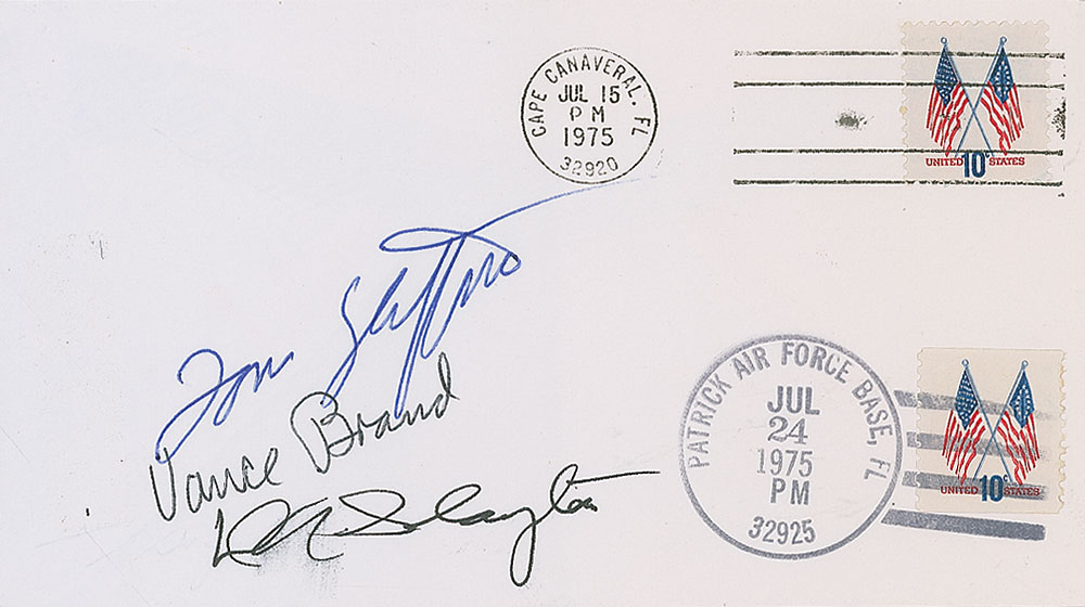 Two covers: a commemorative cover with a cachet honoring the docking of the Apollo and Soyuz spacecraft, 6.25 x 4.5, signed in black felt tip by Alexei Leonov and in orange felt tip by Valeri Kubasov; and a mailing envelope bearing launch and landing date postmarks, 6.5 x 3.5, signed in ballpoint by Tom Stafford and Vance Brand, and in black ink by Deke Slayton. In overall fine condition, with some brushing to Slayton’s surname. Pre-certified Zarelli Space Authentication.
