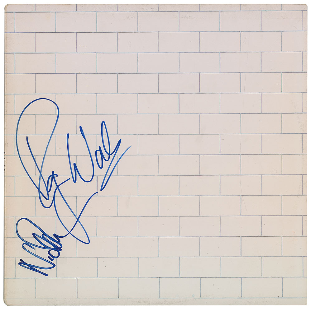 The Wall album signed on the front cover in blue felt tip by Roger Waters and Nick Mason. In fine condition, with trivial rubbing and edgewear, and some soiling to back cover. The record is not included. Originally obtained by in-person specialist Mike Wehrmann. Pre-certified REAL.
