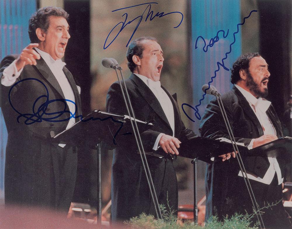 Color satin-finish 14 x 11 photo of The Three Tenors performing in concert, signed in blue felt tip Jose Carreras, Placido Domingo, and Luciano Pavarotti. In fine condition, with evenly trimmed edges and a slightly grainy quality to the image. Originally obtained by in-person specialist Mike Wehrmann. Pre-certified PSA/DNA.