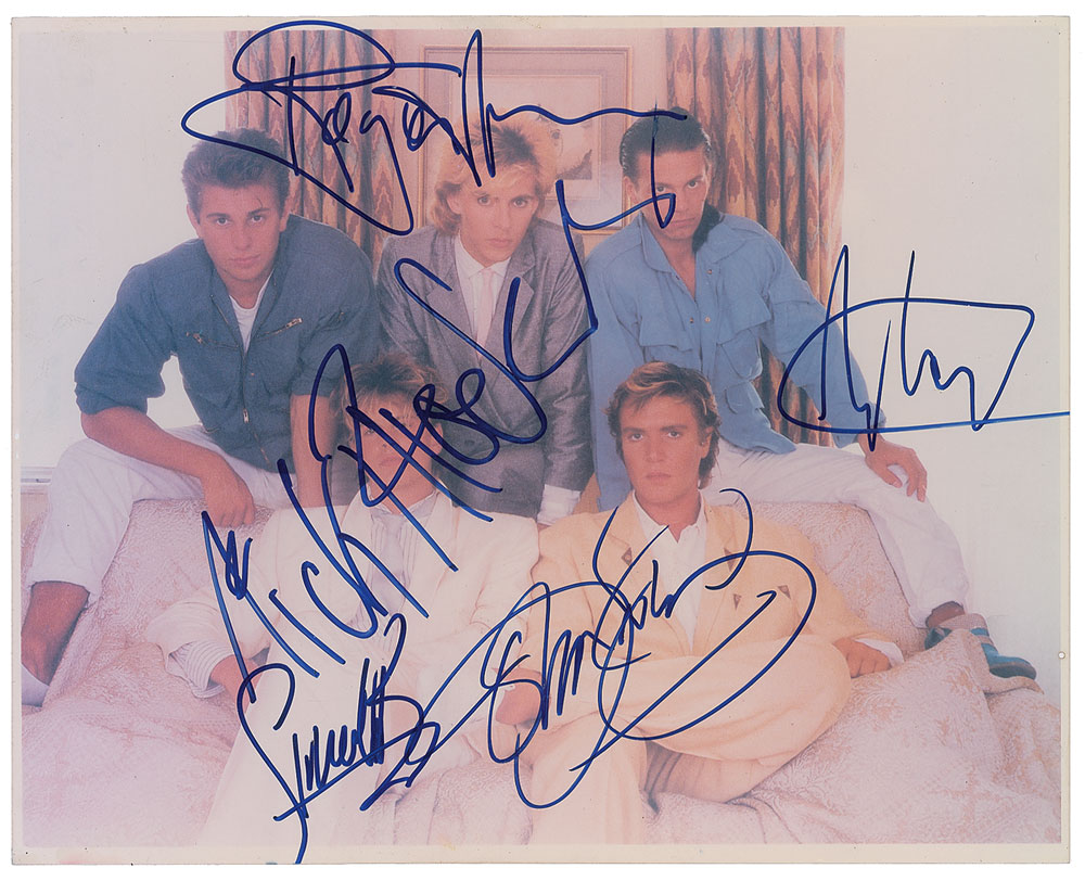 Color glossy 10 x 8 photo of Duran Duran in a living room setting, signed in blue felt tip by John Taylor, Nick Rhodes, Simon Le Bon, Andy Taylor, and Roger Taylor. In fine condition, with a tiny hole to right edge. An unusual, fully signed photo of the band during the peak of their fame. Pre-certified REAL.