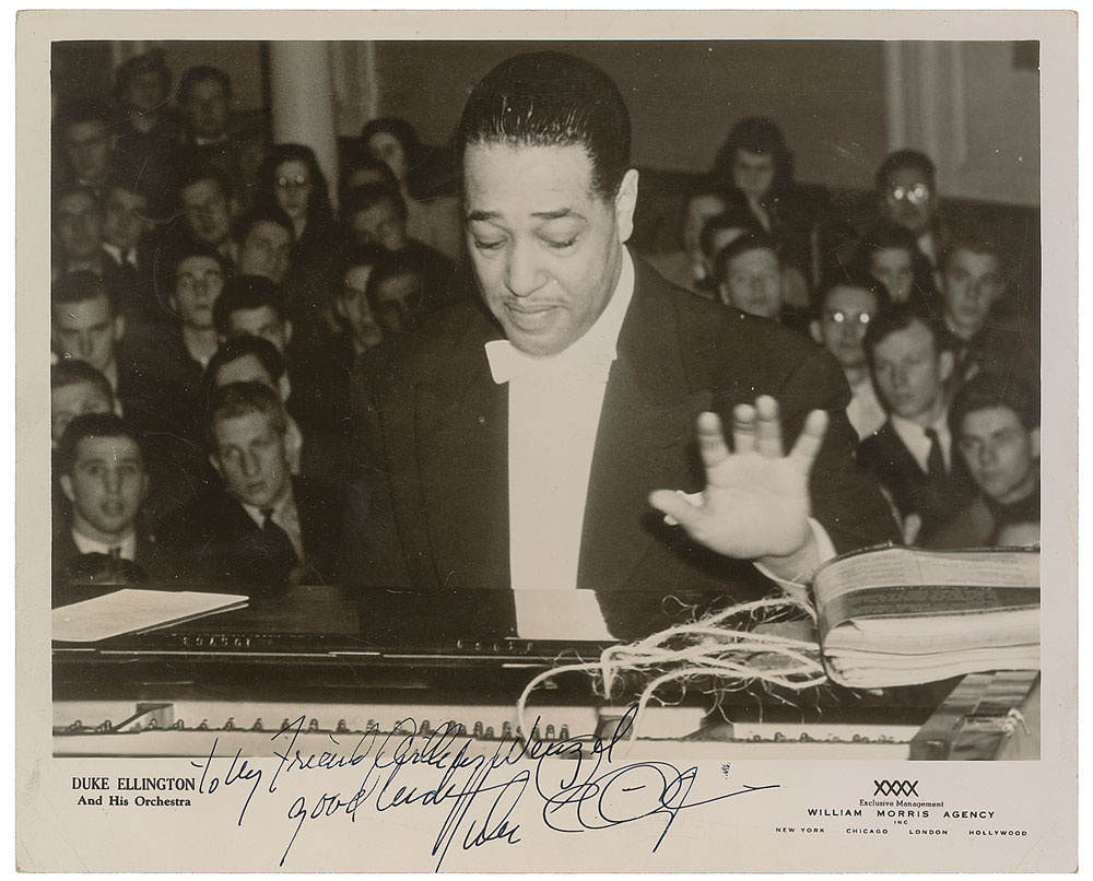 Vintage glossy 10 x 8 William Morris Agency publicity photo, nicely signed and inscribed in fountain pen, “To my friend Arthur Wenzel, good luck, Duke Ellington.” Scattered bends and creases, otherwise fine condition. Pre-certified PSA/DNA.
