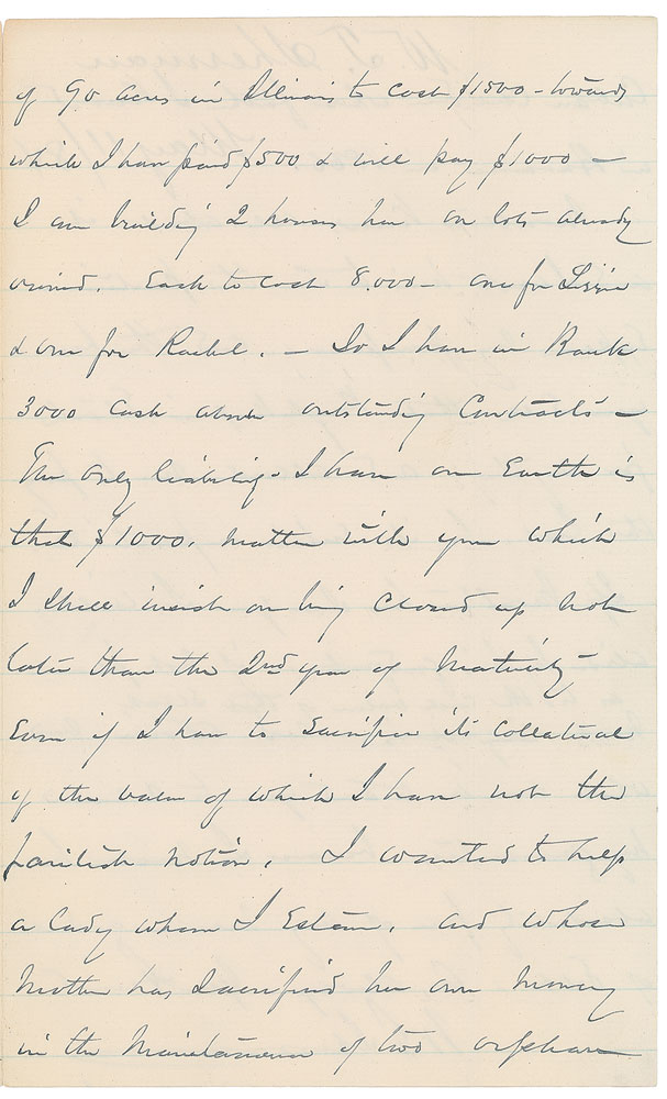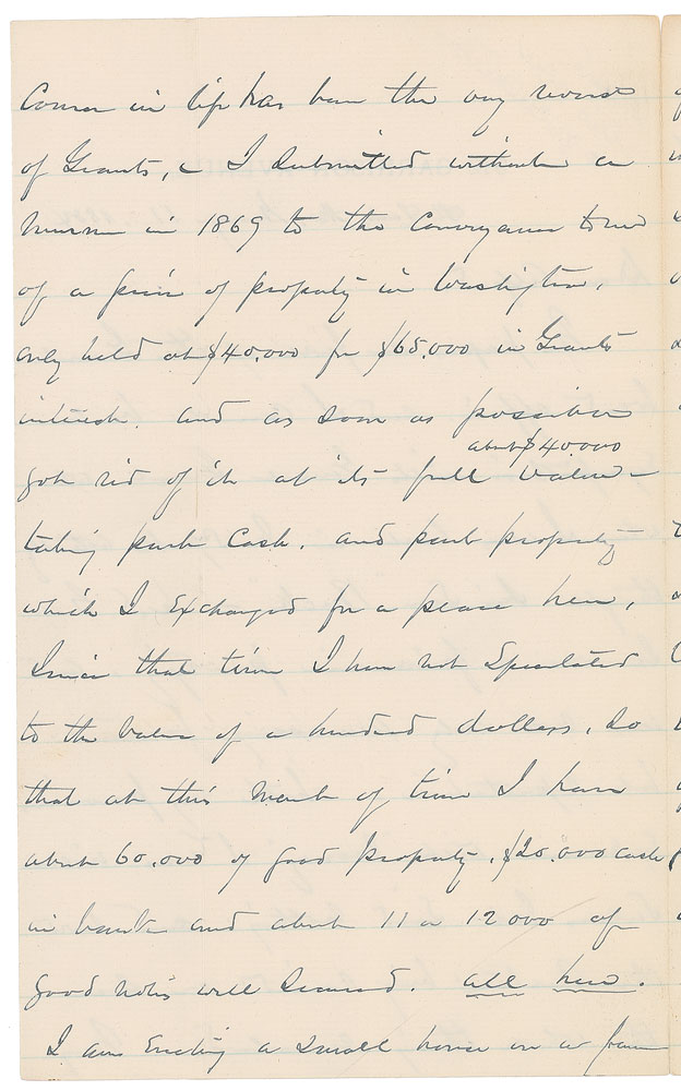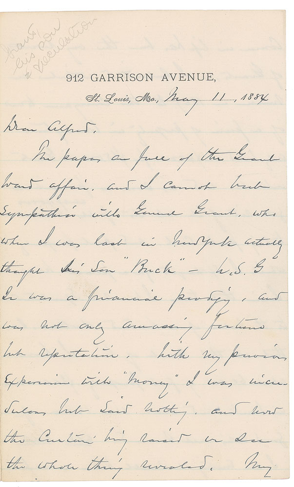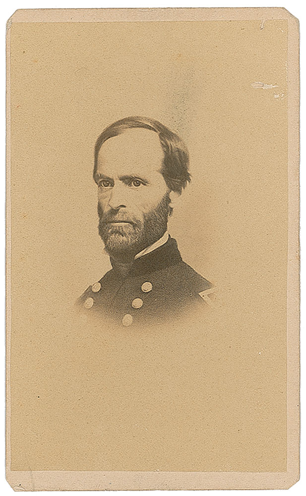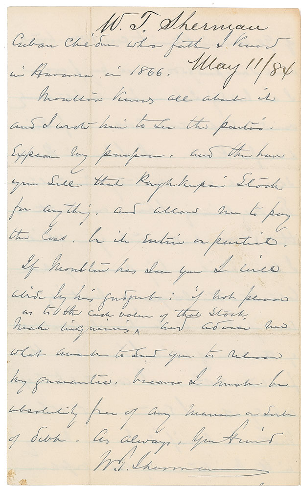 ALS signed “W. T. Sherman,” four pages on two adjoining sheets, 5 x 8, personal letterhead, May 11, 1884. In part: “The papers are free of the Grand Ward affair, and I cannot but sympathize with General Grant, who when I was last in New York actually thought his son ‘Buck’—U. S. G. Jr. was a financial prodigy, and was not only amassing fortune but reputation. With my previous experiences with ‘Money’ I was incredulous but said nothing, and now the curtain’s being raised we see the whole thing revealed. My course in life has been the very reverse of Grant’s.” In fine condition, with intersecting folds and trivial soiling. Accompanied by an unsigned carte-de-visite portrait of Sherman. President Grant’s son had established a brokerage firm with notorious swindler Ferdinand Ward, who ran the firm as a Ponzi scheme. It collapsed in 1884 and the Grant family lost nearly everything along with other investors such as Thomas Nast. Pre-certified PSA/DNA.