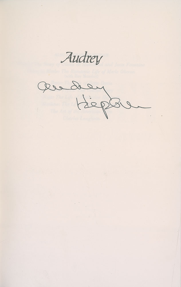 Signed book: Audrey: The Life of Audrey Hepburn. First edition, first printing. NY: Macmillan, 1984. Hardcover with dust jacket, 6.25 x 9.5, 228 pages. Nicely signed on the half-title page in black felt tip, “Audrey Hepburn.” In fine condition. Pre-certified PSA/DNA.