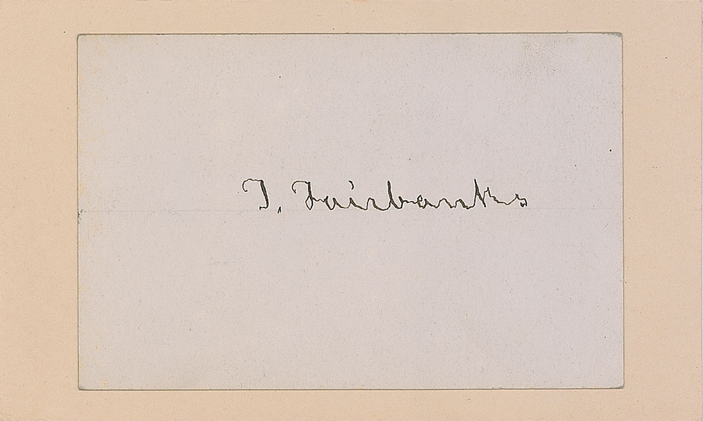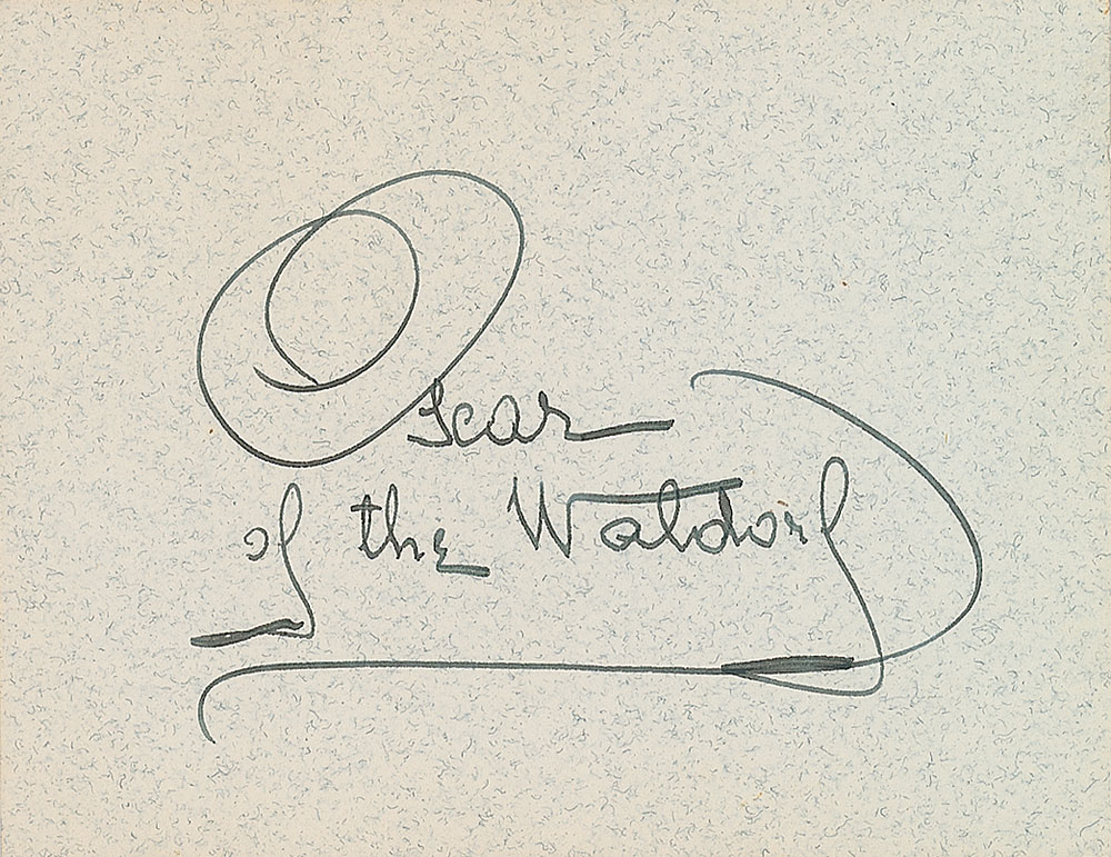 Interesting pairing of signatures from two culinary inventors: a fountain pen signature of the inventor of the the Waldorf salad, developer of Eggs Benedict, and cookbook author Oscar Tschirky, “Oscar of the Waldorf,” on an off-white card; and an ink signature of the inventor of the platform scale, cook stoves, and refrigerators Thaddeus Fairbanks, “T. Fairbanks,” on an off-white card. In overall fine condition. Pre-certified PSA/DNA.