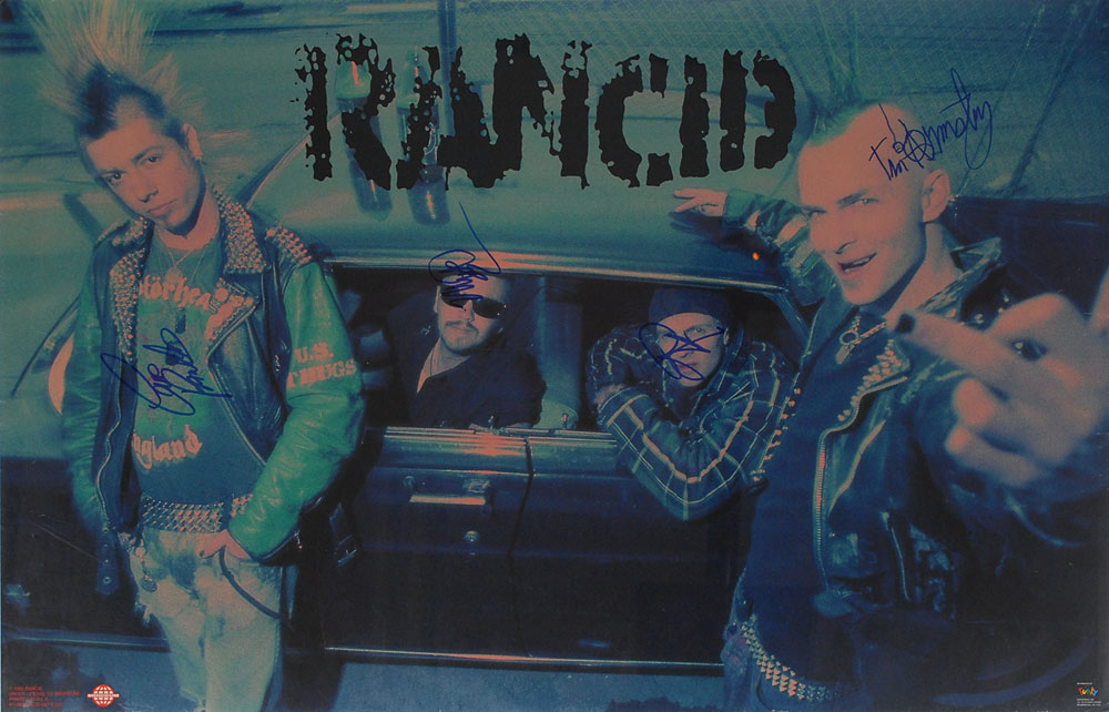 Pair of identical color 34.5 x 22.25 Brockum posters of Rancid, both signed in blue felt tip by Tim Armstrong, Lars Frederiksen, Matt Freeman, and Brett Reed, with one of the posters inscribed. Rolled and in overall fine condition, with trivial creasing and a tear to left edge of the inscribed poster. The Warren Cohen Collection. Pre-certified PSA/DNA.