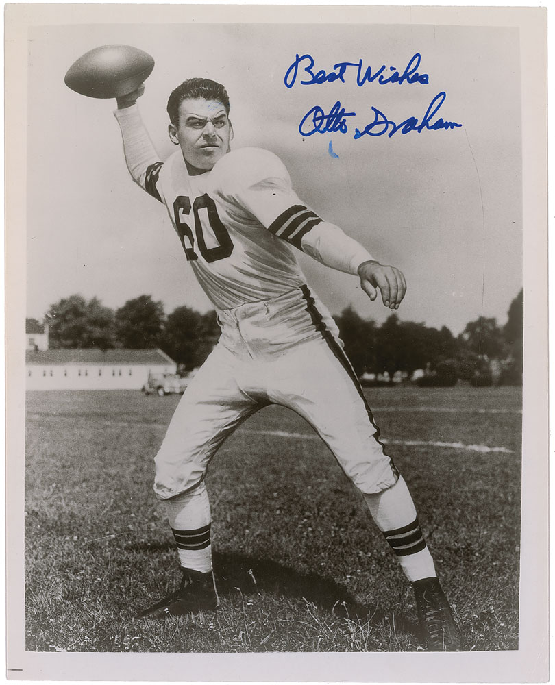 Identical set of three glossy 8 x 10 photos showing Graham posing in his uniform, his arm locked and loaded for a pass, each signed in blue felt tip, “Best Wishes, Otto Graham.” In overall fine condition, with trivial creasing and surface impressions, and a stray ink mark and slight brushing to the signature on one photo. Pre-certified PSA/DNA.