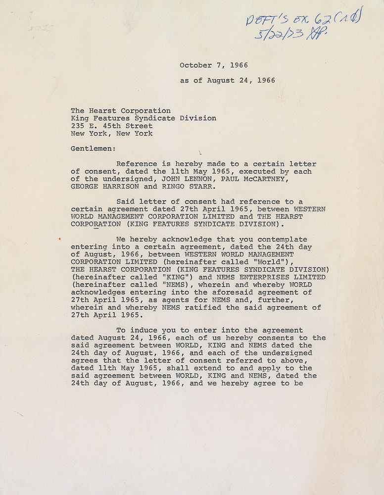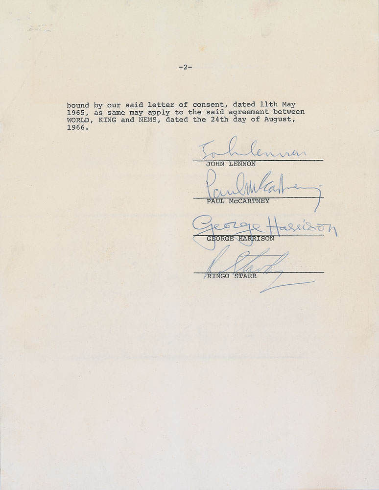 Outstanding DS, signed “John Lennon,” “Paul McCartney,” “George Harrison,” and “R. Starkey,” two pages, 8.5 x 11, October 7, 1966. Document confirming the extension of an agreement between NEMS, Western World Management, and the Hearst Corporation’s King Features Syndicate Division which had been made the previous year. Nicely signed at the conclusion in blue ballpoint by all four band members. In fine condition, with expected handling wear and staple holes to upper left corner of each page.